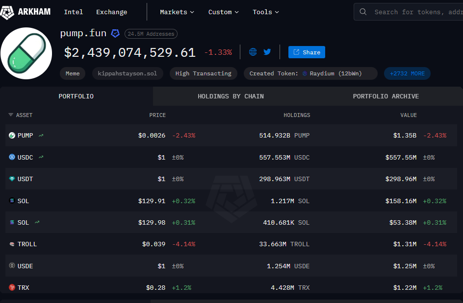 Blockchain veri platformu Arkham’a göre, Pump.fun adlı kripto para birimi cüzdanında hâlâ yaklaşık 855 milyon dolar stablecoin ve 211 milyon dolar Solana (SOL) tokeni bulunuyor.
