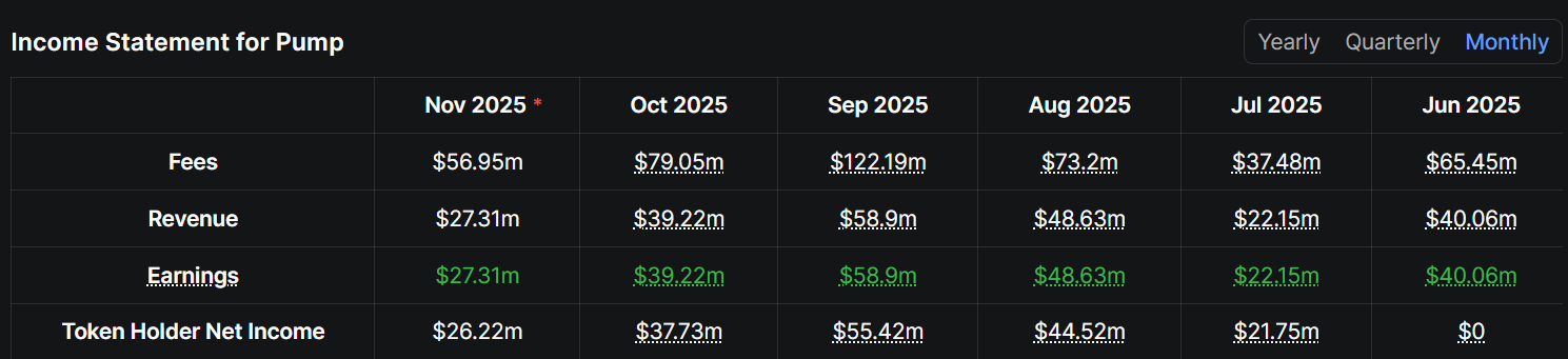 DefiLlama’nın verilerine göre Pump.fun’un aylık geliri Temmuz ayından bu yana ilk kez 40 milyon doların altına düşerek Eylül ayındaki 58,9 milyon dolardan %53 düşüşle Kasım ayında 27,3 milyon dolara geriledi.