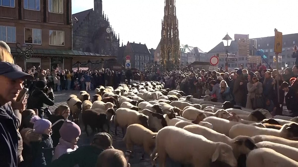 Almanya’nın Nürnberg kentinde, Pazar günü yaklaşık 600 meleyen koyun kışlama alanlarına giderken tarihi merkezden geçerken yayalar kenarda durdu.